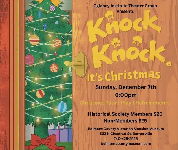 Join us at the Museum for Knock Knock It’s Christmas presented by the Oglebay Institute Theater Group on Sunday, December 7th at 6:00 PM. Please note that the production will take place in the 3rd floor ballroom, so there will be some steps to climb.